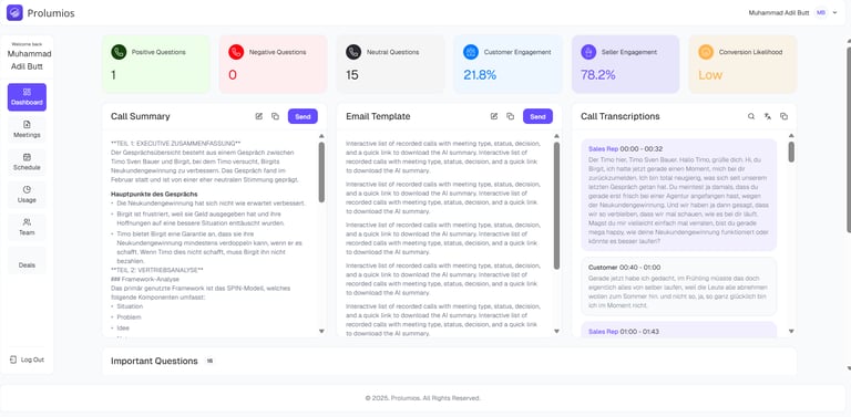 2. Scorecard & Insights Du erhältst einen objektiven Score: Wurden die Budget-Fragen gestellt? Gab es klare Next Steps? Wurden alle Entscheider abgeholt?